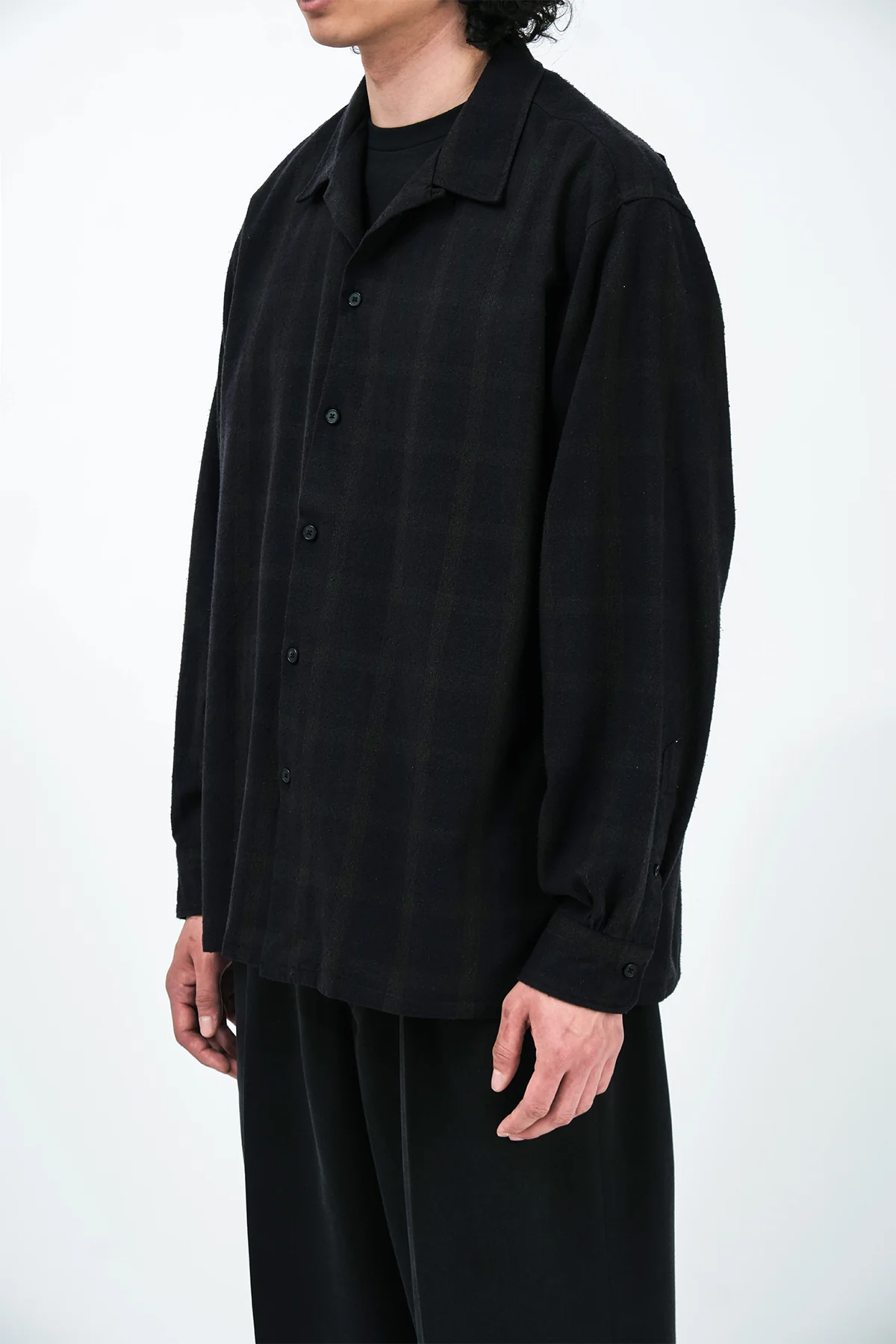 The Silk Nep Loop Collar Shirt from A.Presse Spring Summer 2026 is crafted from checked silk nep woven with pre-dyed yarns in a black watch pattern. It features an open collar with a narrow front placket, a moderate roomy silhouette, and a square-cut hem with deep side slits, with seam allowances left open at the upper collar for a natural drape. It is finished with three narrow tucks at the cuffs and original horn buttons.