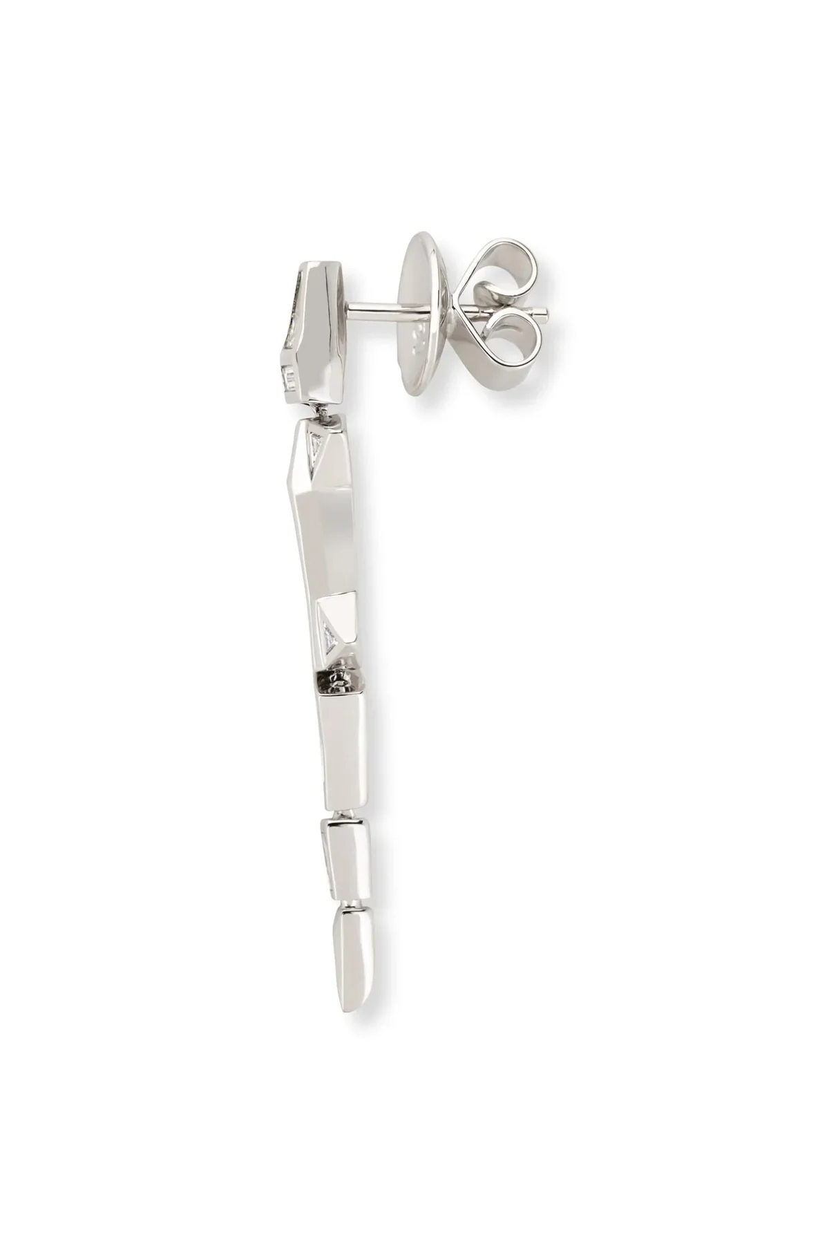 Bibi van der Velden Diamond Alligator Earring in 18k white gold. Decorated with 14 dazzling baguette-cut diamonds, these earrings are a refined take on the brand’s signature motif.