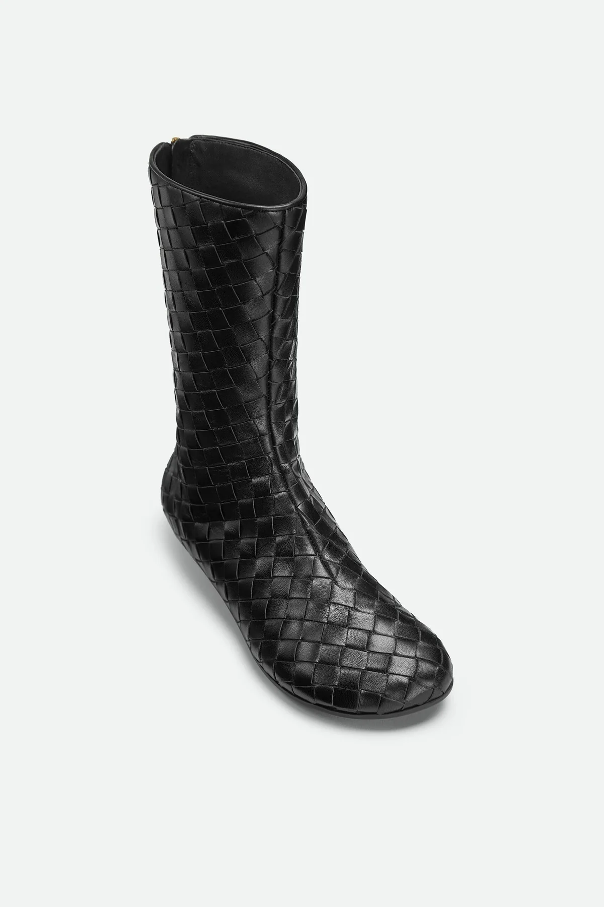 Bottega Veneta women’s black lambskin Atomic Boot. Calf-length style with Intrecciato weave design, flat heel, and rounded toe.
