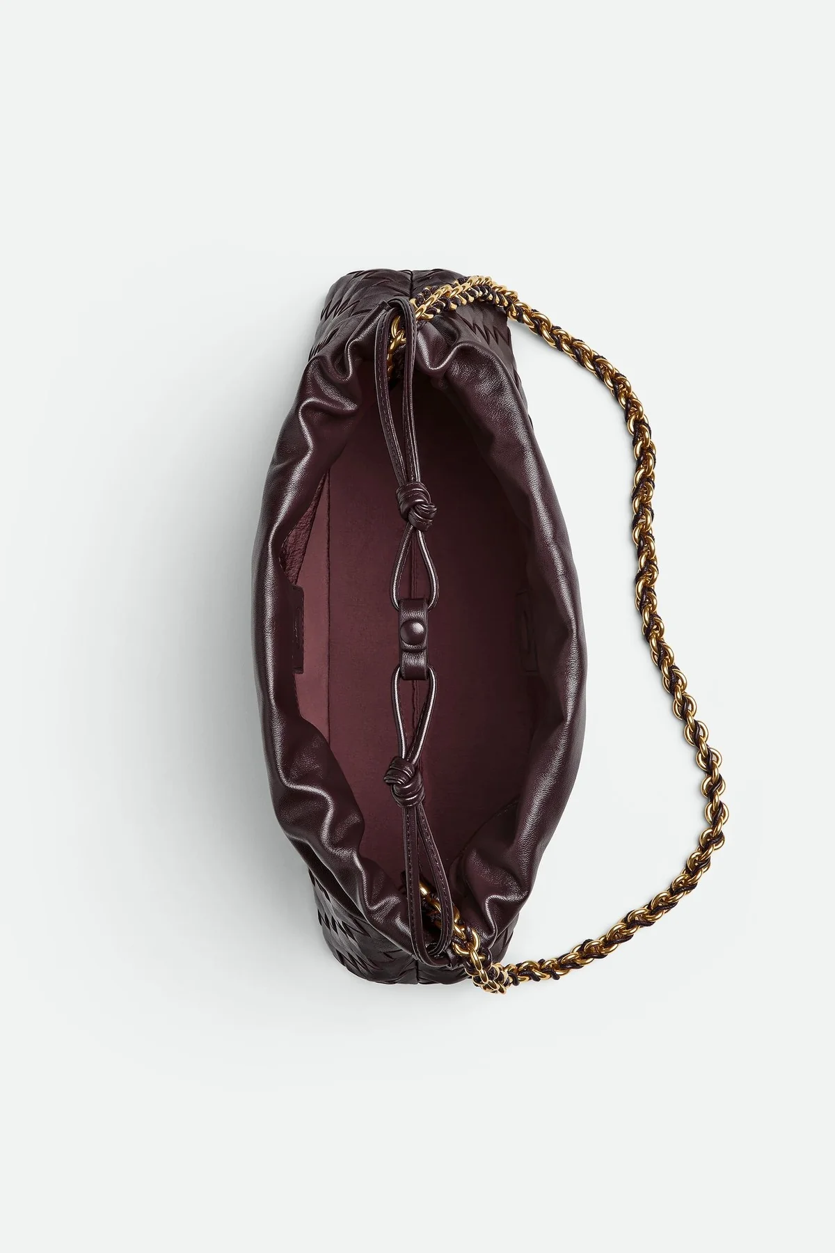 Bottega Veneta Dustbag Notte. Deep burgundy calf leather pouch bag with tubular leather braided metal chain. Drawsting closure and loop attachment for shoulder carry. One main compartment. Signature Intrecciato weave design.