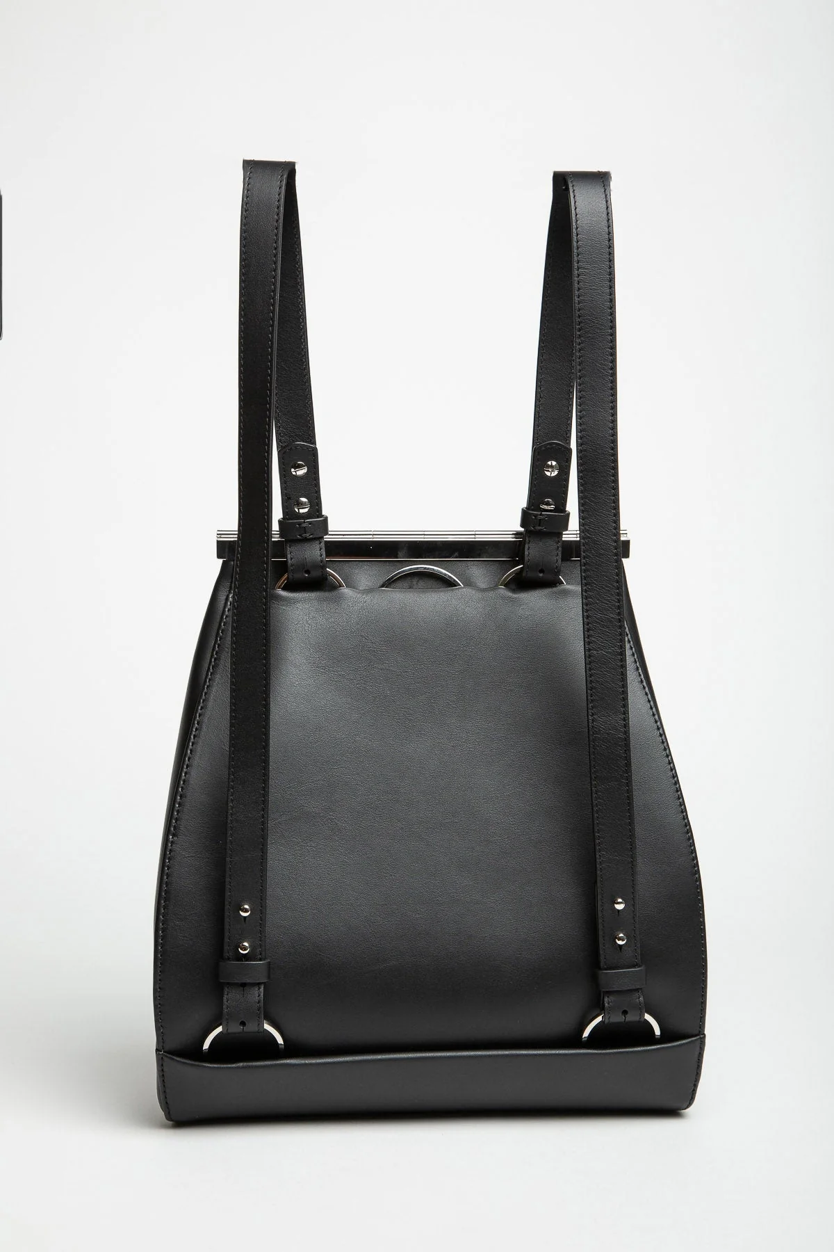 Alicia Backpack from Daana Saakena. Adjustable and detachable leather shoulder strap, pearl detail on inside pocket, and single interior compartment.
