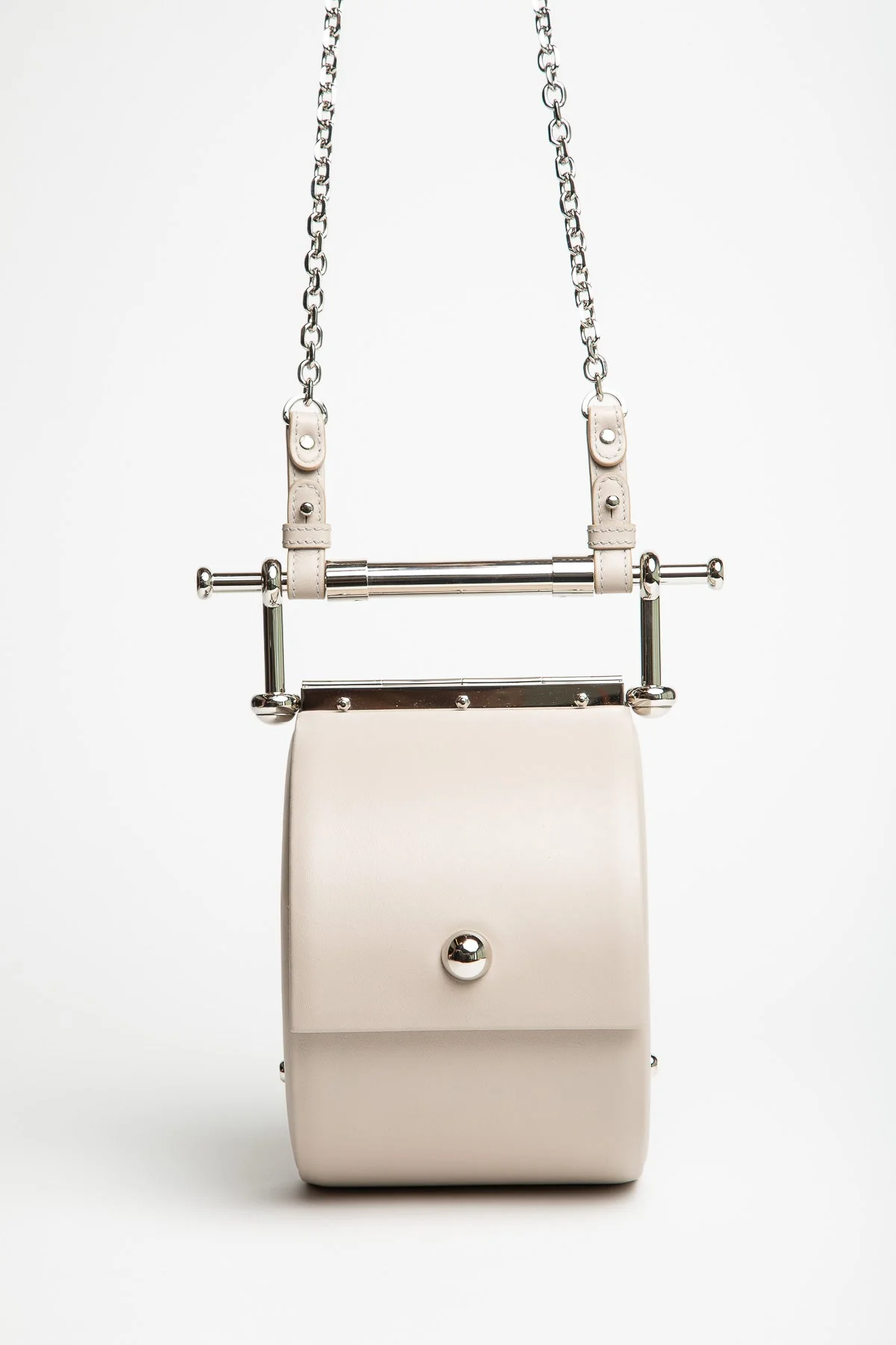 Mini Thana Bag from Daana Saakena. Detachable leather and chain combination shoulder strap, pearl detail on inside pocket, and single interior compartment.