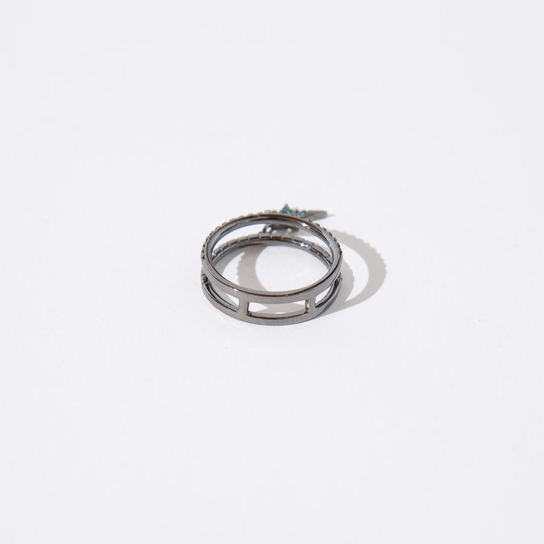 Blue diamond double Cosmos star charm ring from the Diane Kordas jewelry collection. Cast in black rhodium with a mix of black, white and blue diamonds, this double-banded diamond ring creates the illusion of a stacked ring style.