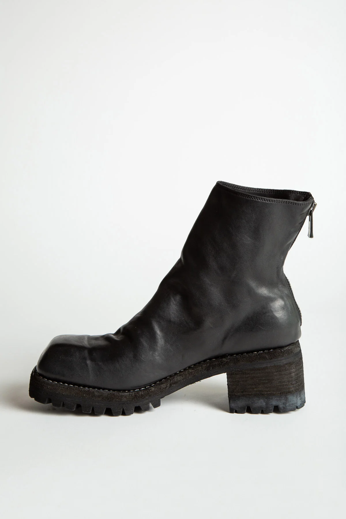 Guidi women’s 9086V Back Zip Boots in full grain soft horse leather. Black leather ankle boots with square toe and back zipper closure. Features stacked heel with treaded sole.