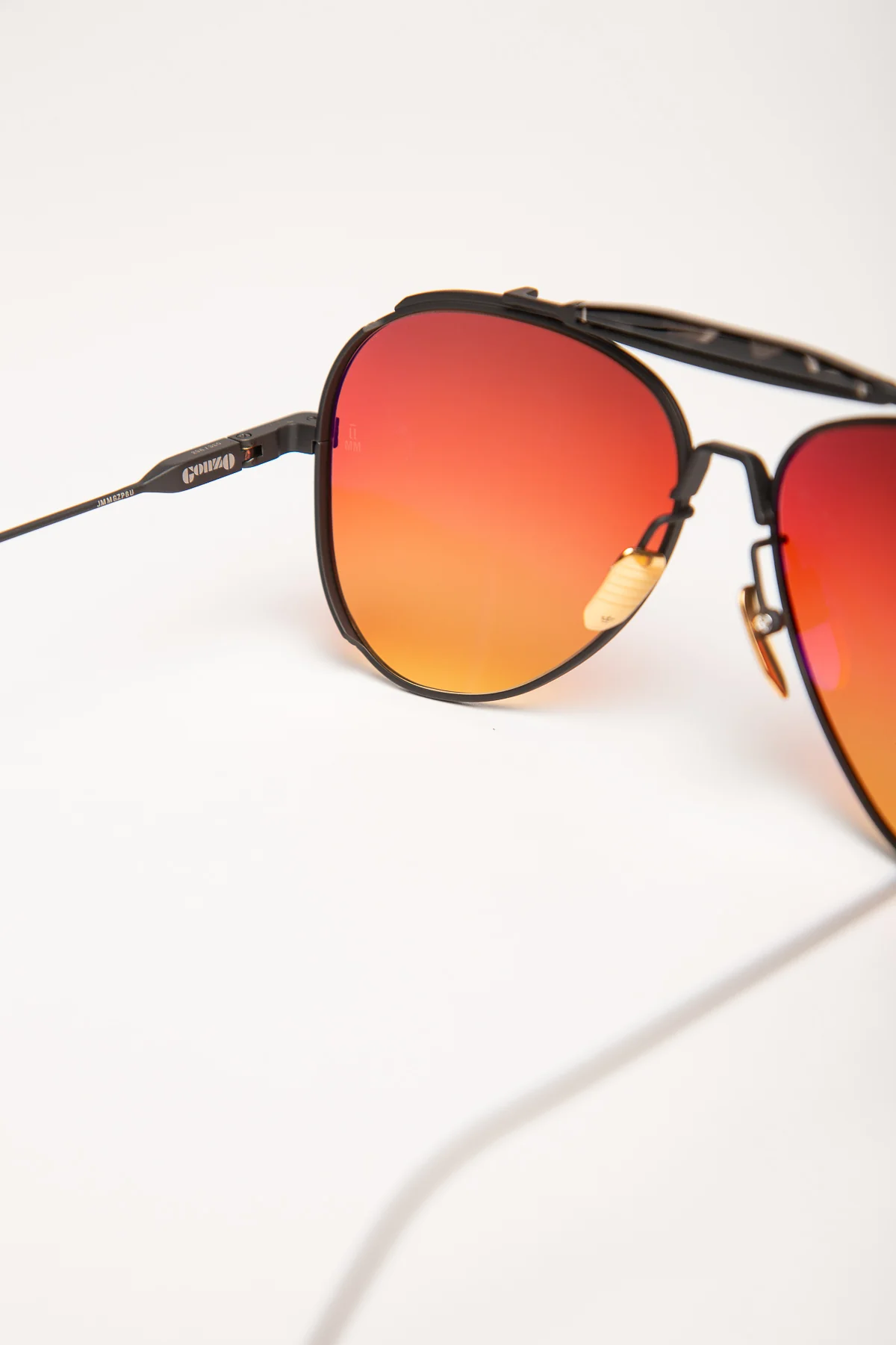 Jacques Marie Mage Gonzo Peyote 2 Sunglasses in Tropic. Limited-edition ’60s-inspired aviators with a matte black beta titanium frame, black tortoise cured cellulose acetate brow bar, and orange gradient lenses. Inspired by Hunter S. Thompson. Part of a limited batch production of 350 pieces.