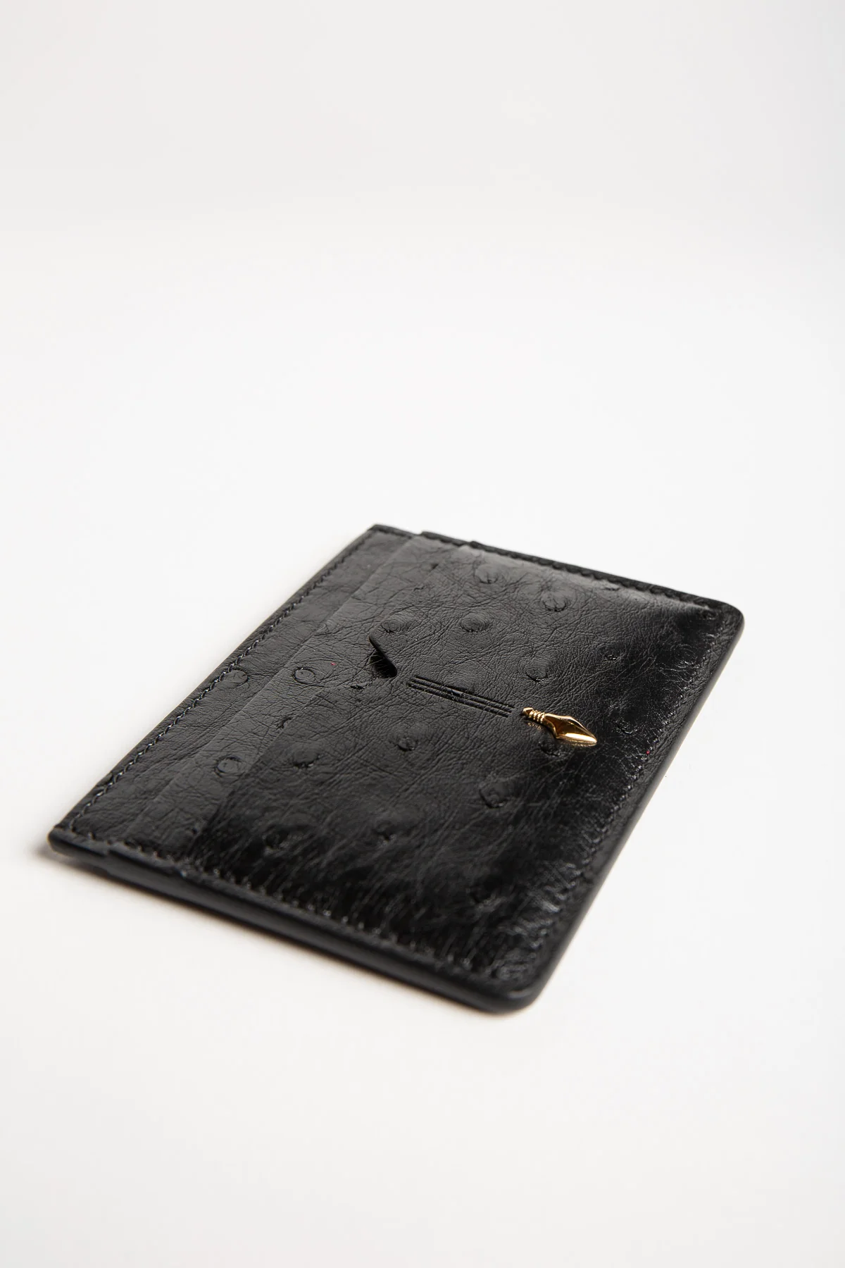 The Theodore Ostrich Card Holder from Jacques Marie Mage features three card slots and a flat pocket, adorned with an elegant arrowhead embellishment in 24k gold-plated metal, subtly displaying JMM's signature hairline details.