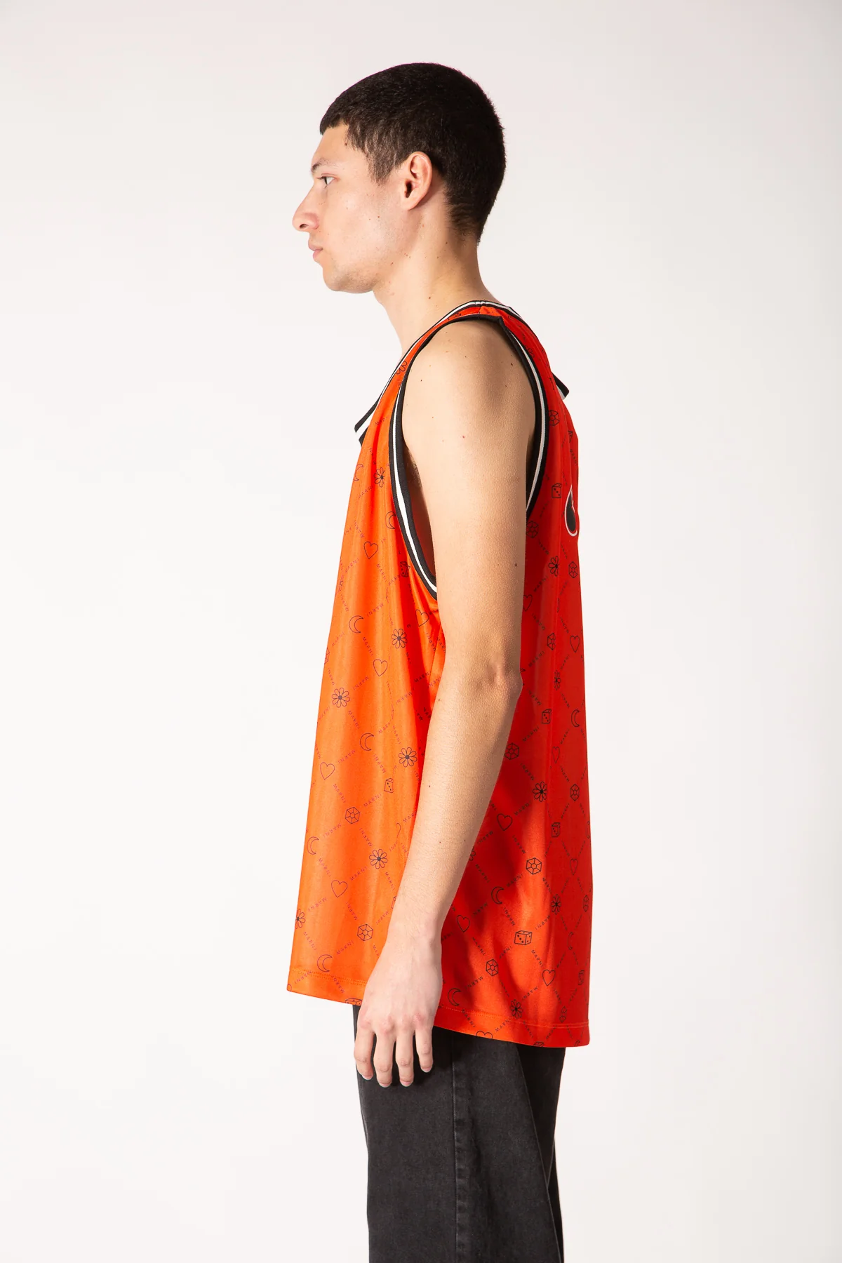 Marni menâs orange Basketball Jersey. Loose fitting tank top with contrast striped black & white trim. Features branded motif all over and number graphic on the back. European sizing. Â