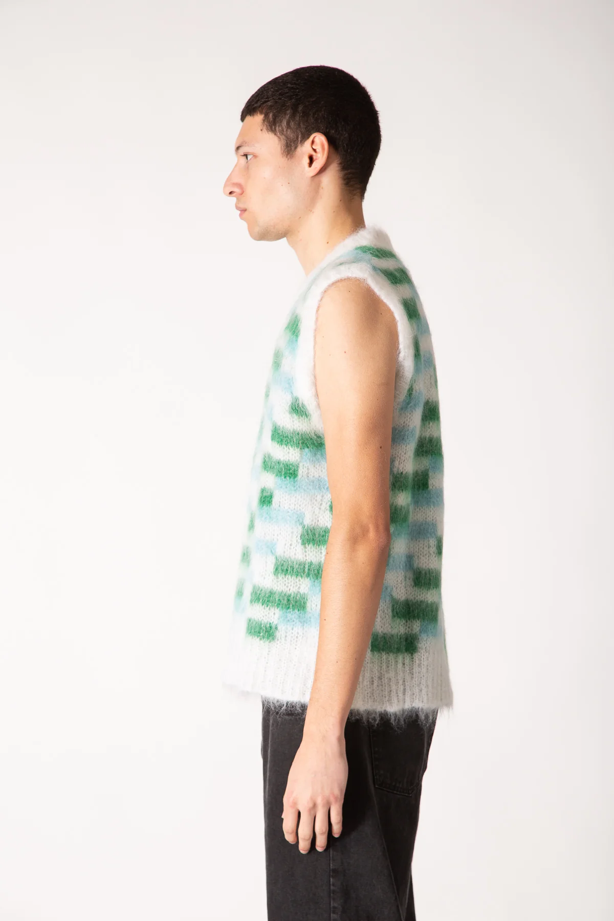 Marni menâs V-Neck Sweater Vest. Sleeveless knit cardigan sweater with V-neckline and ribbed trims. Designed in a brush mohair and wool blend fabric with two-tone inlaid check motif in blue, green and white. Â