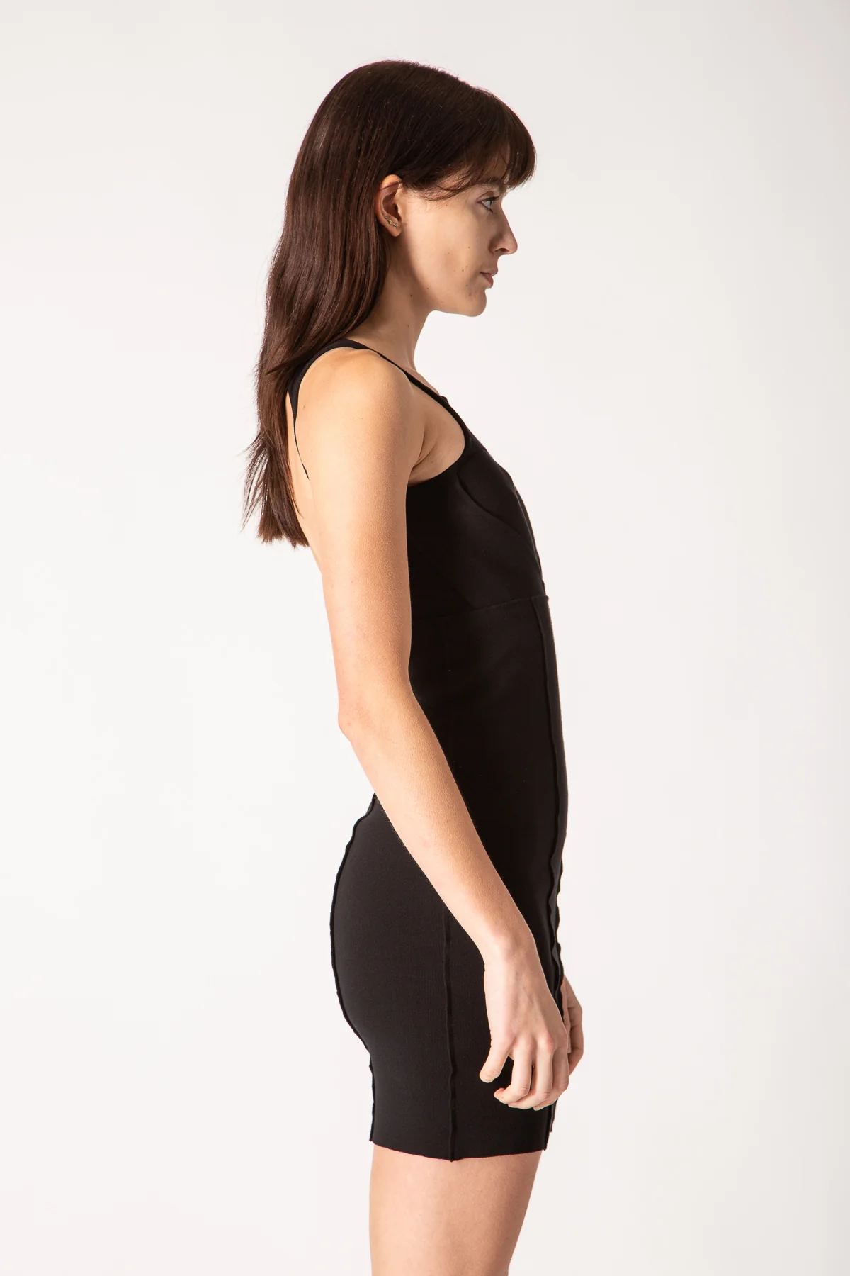 Rick Owens sleeveless Sling Mini Dress in black stretch viscose knit. Sleek, skin tight mini dress featuring a cut-out V front with wide band across the chest. Defined by slim shoulder straps and an open back design.