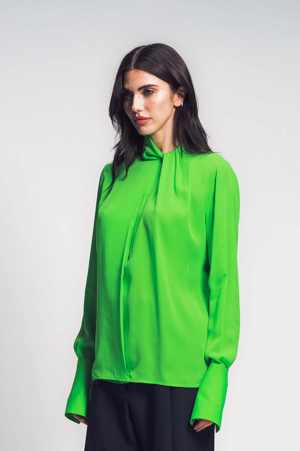 The Washed Silk Georgette Long Sleeve Blouse from Tom Ford Fall Winter 2025 is crafted from fluid washed silk georgette in Green Flash. It features a softly draped collar with a subtle front cut-out, a deep knife pleat at the front, a delicate kissing pleat at the back, a concealed hook-and-eye closure at the collar, and self-covered buttons at the cuffs.