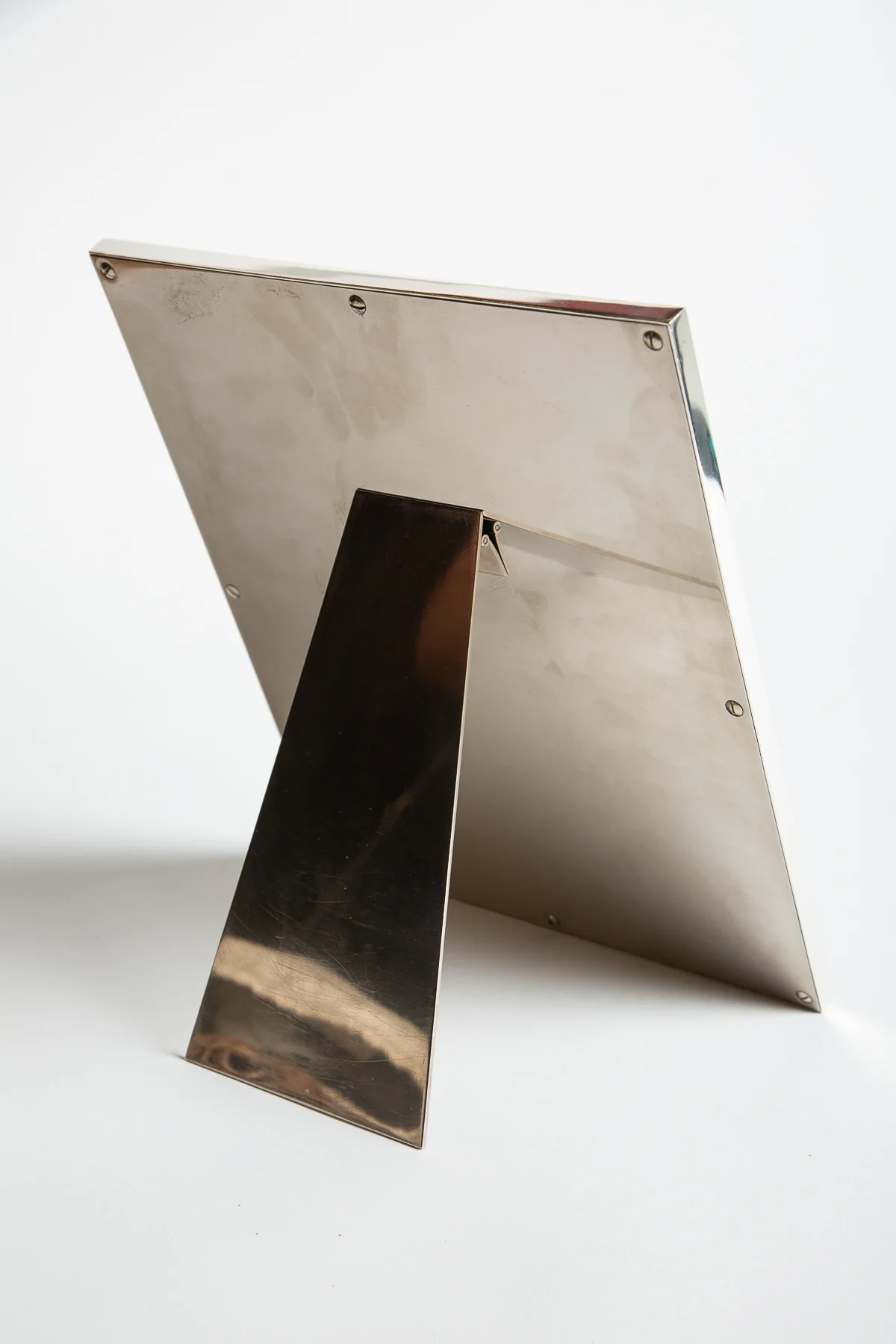 Vintage Hermès framed beveled mirror. Defined by a sterling silver frame and sharp angular features. The perfect sculptural tabletop accessory for checking your reflection.